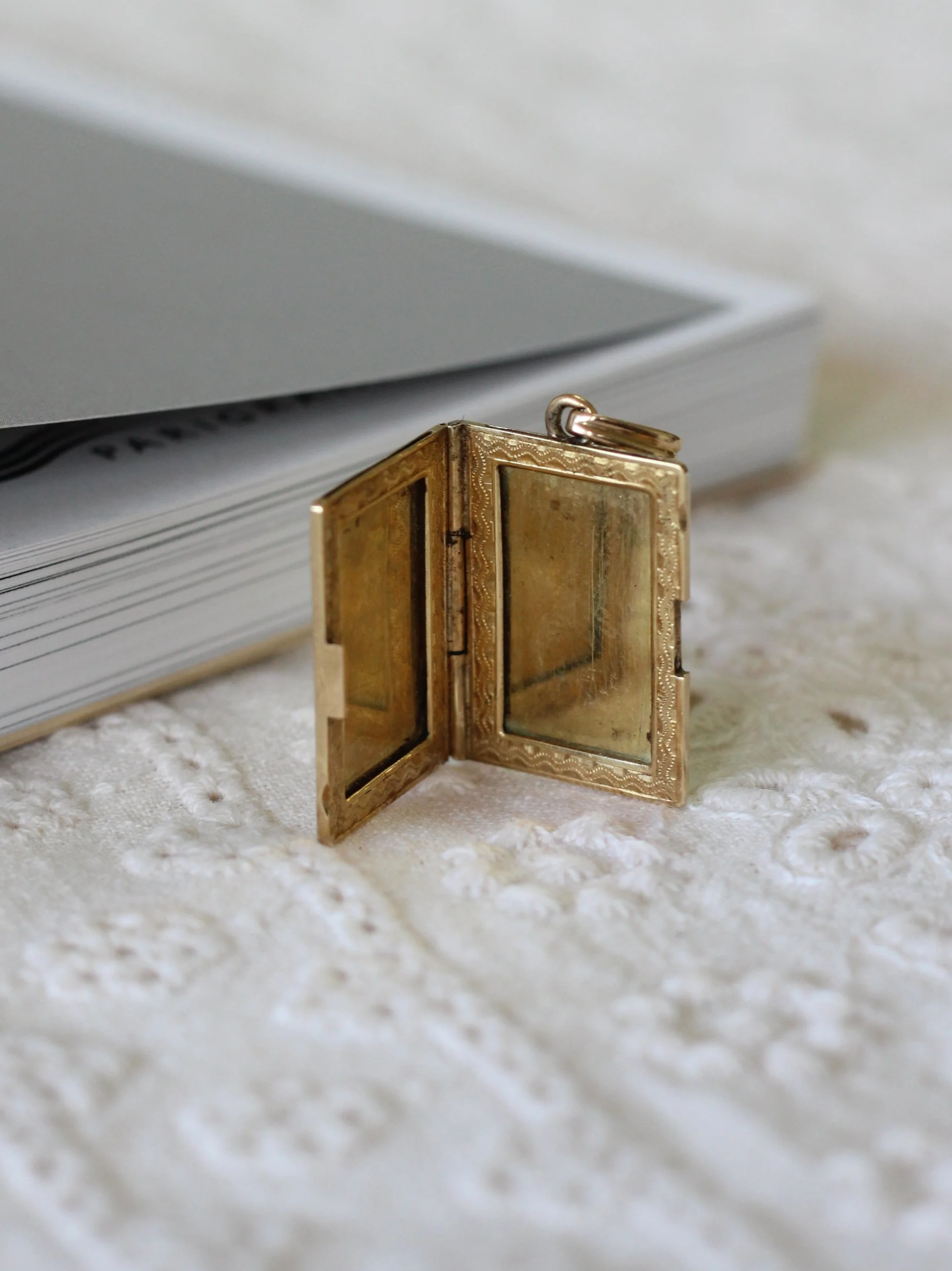 A timeless vintage locket, finely crafted in warm yellow gold and adorned with a delicate floral engraving. The front is beautifully detailed with graceful blossoms, each centered with a sparkling diamond that catches the light with every movement. The textured gold surface and engraved border add depth and elegance to the design.