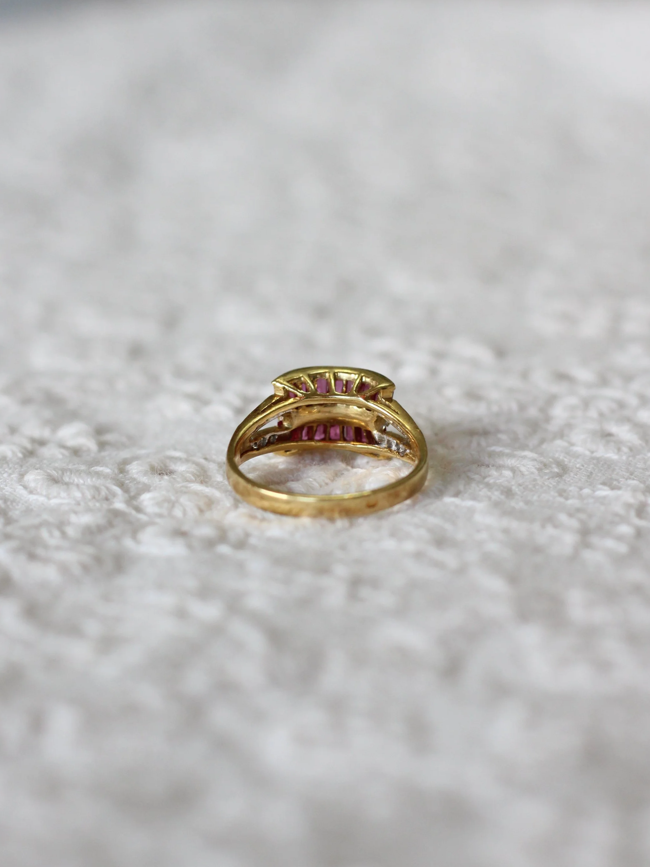 Part of a striking trio that celebrates iconic gemstones, this ring features a radiant ruby set in a sleek yellow gold band. The ruby’s rich pinkish-red hue adds warmth and depth, perfectly complemented by the ring’s clean, modern silhouette. Whether worn on its own or paired with the emerald and sapphire rings, it’s a timeless expression of color, love, and vintage charm.